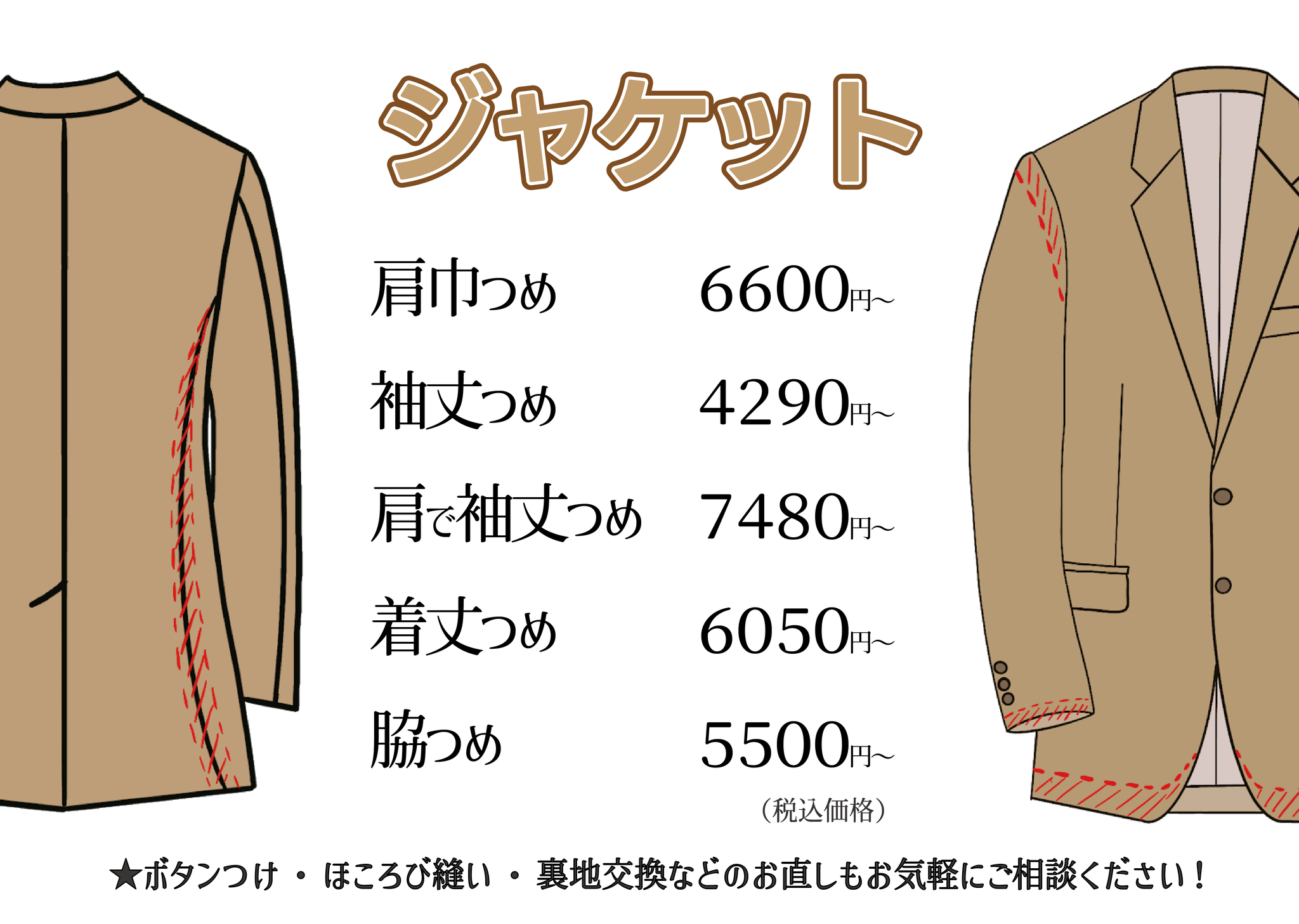 脇つめ | 5500円~ | そで丈つめ | 2420円~ | |